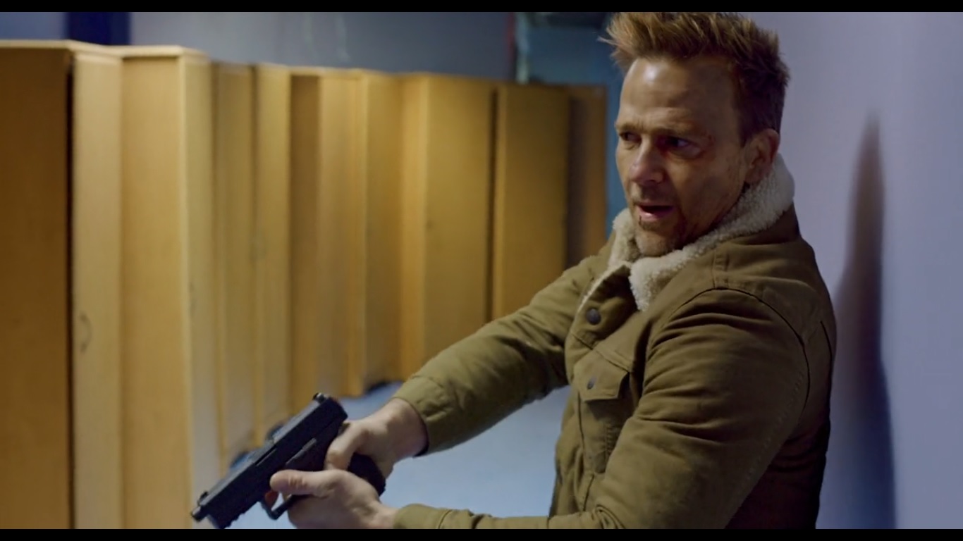 Their main sniper Jackson (Marc Dacascos of Only the Strong, Drive, The Crow: Stairway to Heaven, Brotherhood of the Wolf, Cradle 2 the Grave, I Am Omega, Wolvesbayne, Kamen Rider: Dragon Knight, Agents of S.H.I.E.L.D. And John Wick: Chapter 3- Parabellum) is topside and takes care of the roving cop checking on the VA, only to get smoked like salmon.